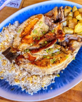 POSTA DE PEIXE FRITA, ARROZ BRANCO, PIRÃO. Obs: foto meramente ilustrativa